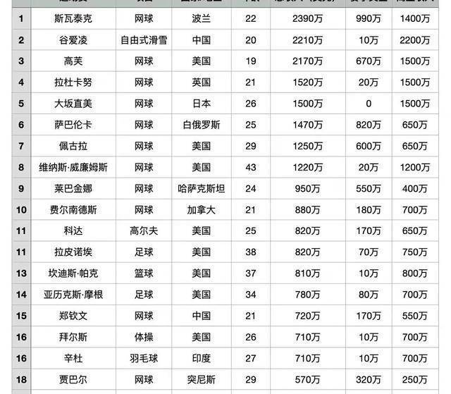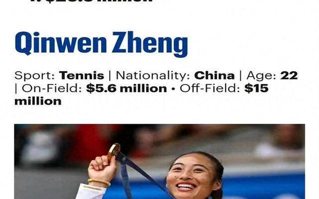 福布斯发布了2024年全球收入最高的女领略员排名榜,中国选手谷爱凌排名第3,而刚在2022年8月赢得奥运会网球金牌的中国选手郑钦文则排在第4位。
