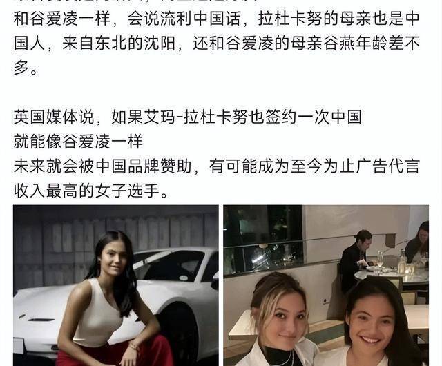 来自英国的网球选手拉杜,她是谷爱凌的好友,相通领有中外混血血缘,而且是斯坦福大学的学生,如故收货优异的学霸,母亲也从事经济职责。