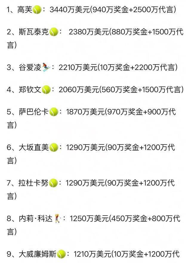 字据2023年女领略员收入排名榜,前十名中独一非网球选手是解放滑雪领略员谷爱凌。